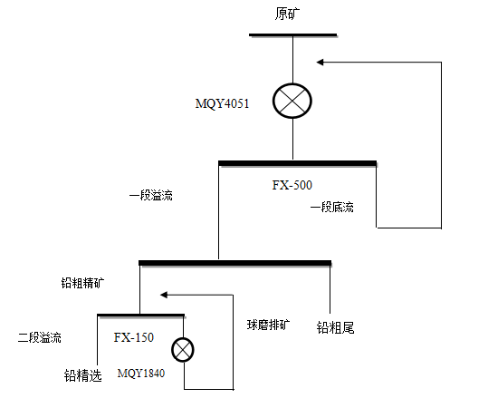 破碎后的礦石自粉礦倉下端的皮帶給料機(B=800㎜ L=1.5m)給入5、6#皮帶運輸機(B=800㎜ L=38m),經(jīng)5、6#皮帶輸送至球磨(Ф4000×5100㎜)內(nèi),給礦的同時按比例加入給礦水,以控制磨礦濃度在80%左右,礦石在球磨機內(nèi)經(jīng)鋼球沖擊研磨后排出到圓筒篩上,大于圓筒篩篩孔的礦石及碎小鋼球排到“頑石”筒后,再吊運回球磨機,小于圓筒篩篩孔的礦石隨礦漿自流到砂泵池內(nèi),礦漿經(jīng)稀釋水稀釋后由渣漿泵在一定的壓力(壓力=0.04-0.09MPa)、濃度(濃度=58±2%)條件下?lián)P送至Ф500㎜旋流器內(nèi)進行分級,合格粒級產(chǎn)品(-200目60%±2)從旋流器溢流管排出,自流到除屑篩上,將礦漿中的木屑、導爆索等各種雜質(zhì)分離出來。礦漿從除屑篩下自流到鉛浮選調(diào)漿槽。不合格粒級產(chǎn)品,從旋流器沉沙嘴排出,自流返回到球磨機內(nèi),構(gòu)成閉路循環(huán)。