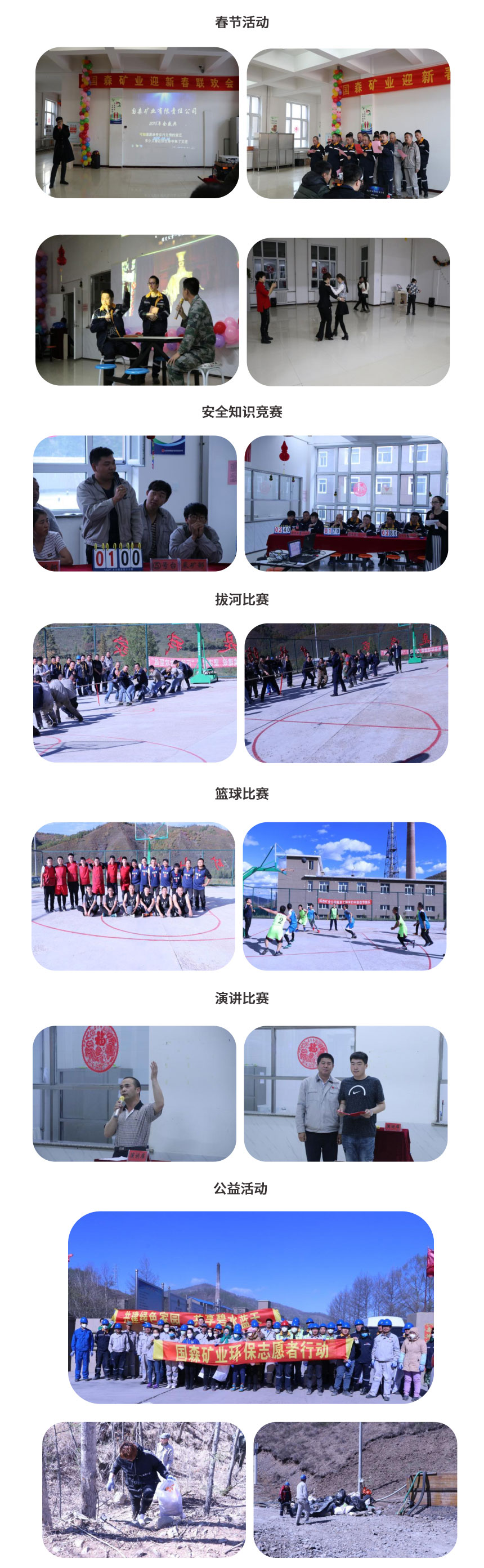 文化活動:在節(jié)日期間,在員工工作之余,公司組織豐富多彩的文體活動,豐富員工業(yè)余生活,增強員工團(tuán)隊意識和凝聚力;組織安全知識競賽及安全培訓(xùn),不斷提高員工安全風(fēng)險意識,規(guī)避風(fēng)險技能大大增強;開展“我愛礦山”“綠水藍(lán)天”環(huán)保公益活動等,積極參加綠色礦山建設(shè)。組織車間開展技能比武活動、演講比賽,提高員工自身技術(shù)素質(zhì)。